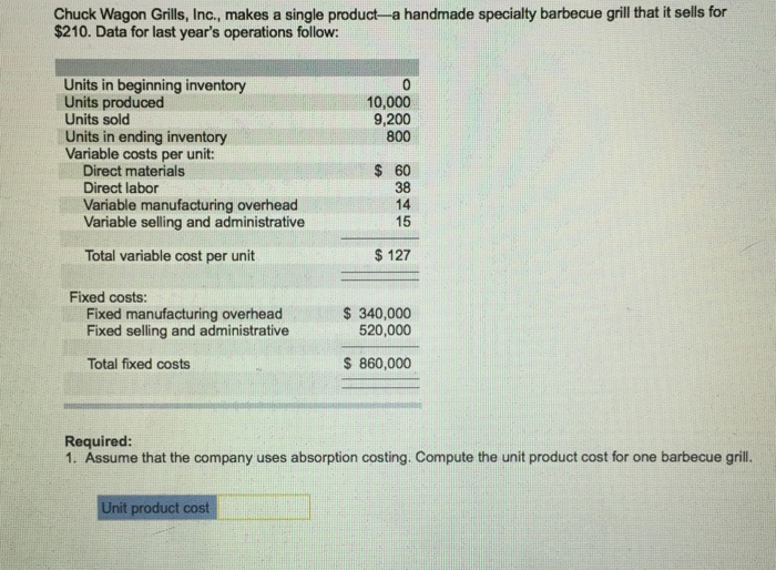 Chuck Wagon Grills Inc makes a single product- a handmade specialty barbecue grill that it sells for 210. Units in beginning inventory Units produced Units sold Units in ending inventory Variable costs per unit. Chuck Wagon Grills Inc makes a single product-a handmade.